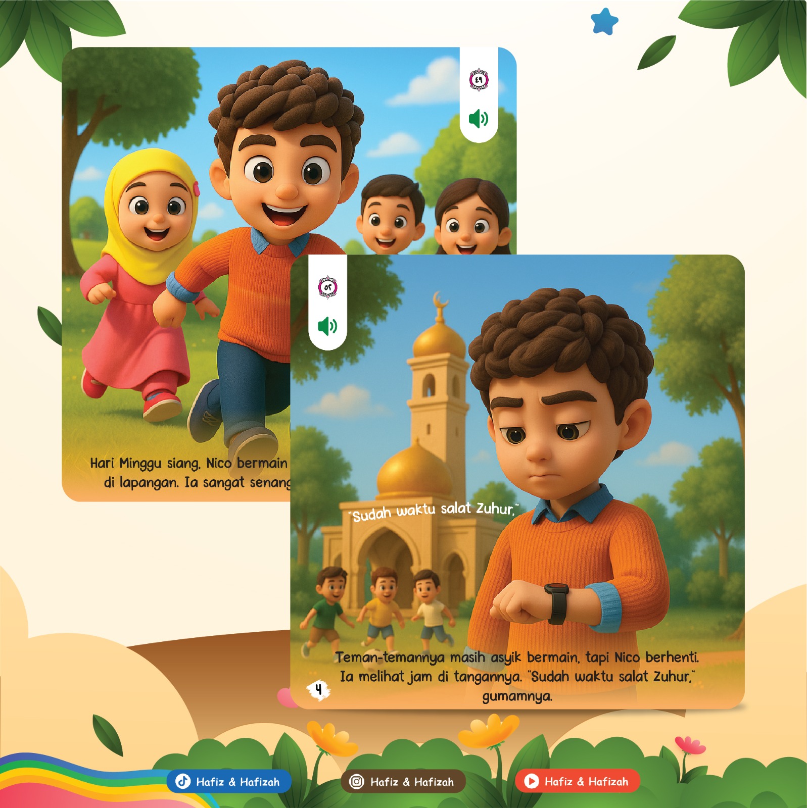 Kisah inspiratif tentang Nico, anak yang belajar menempatkan salat sebagai hal terpenting meskipun sedang asyik bermain. Saat suara adzan terdengar, Nico memilih berhenti bermain dan segera beribadah dengan tenang, tanpa marah atau ragu. Sikapnya yang sabar dan berani menjadi teladan bagi teman-temannya. Cerita ini mengajarkan anak-anak pentingnya mengutamakan salat, menahan diri, dan tetap bersikap tenang dalam setiap keadaan.